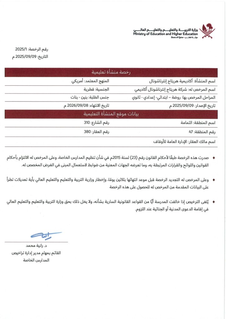 Heritage International Academy delivers high-quality education that combines global standards with Qatari traditions. We nurture students to grow academically and personally, equipping them with the skills and values needed to thrive in the future.